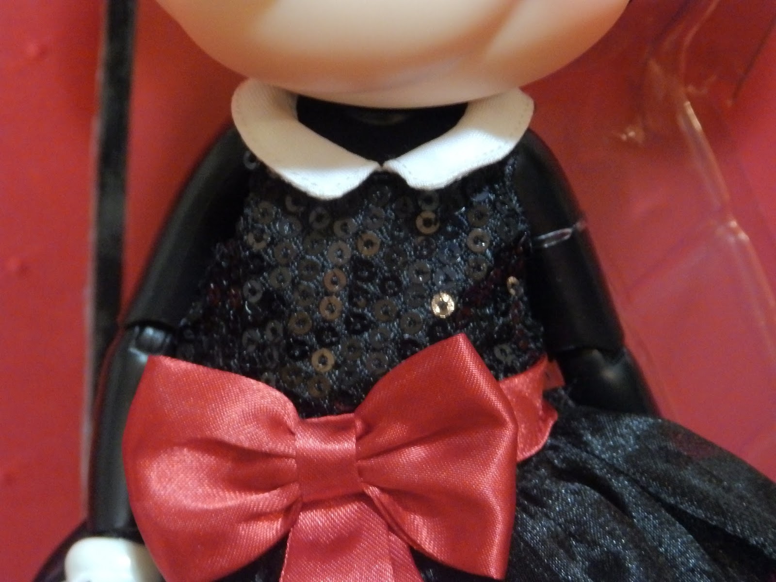 She comes with her gloves molded on her hands and her purse (sequined) with a red bow at the top!)